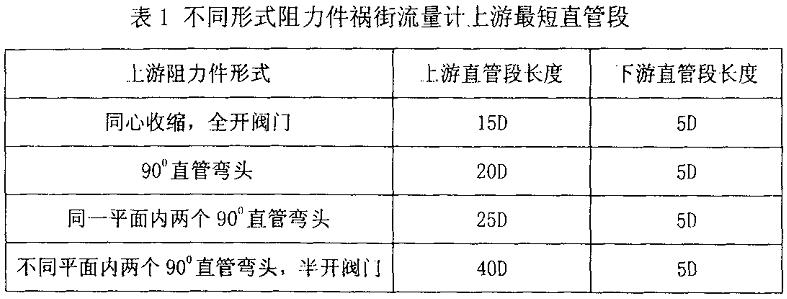 由于渦街流量計是利用流體自身的規則振蕩來計量流量的,因而對流體的速度分向及流動噪聲,比較敏感,因此在應用過程中對管道安裝狀況要求較高。對L游不同形式的阻力件必須配置足夠長的滿足不同要求的直管段,以保證儀表的測量精度。表l給出了不同形式阻力件禍街流量計上游最短直管段。