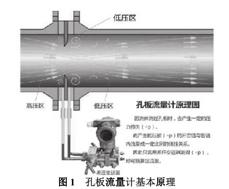 充滿管道的介質,當它流經管道內的孔板流量計時,流速將在孔板處形成局部收縮,使得流速增加,靜壓力降低,孔板前后產生壓差,結構原理如圖 1 所示。介質流量越大,孔板前后的壓差就越大,通過測量壓差來計算流量的大小。