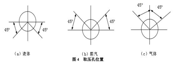 (1)取壓孔角度。測量介質為氣體時,取壓孔設在管道上半部,與管道垂直中心線成 0°~45°夾角,可以避免引壓管積液;測量介質為液體時,開孔在管道下半部,與水平中心線成 0°~45°夾角;測量介質為蒸汽時,開孔在管道上半部,與管道水平中心線成0°~45°夾角,如圖 4 所示。