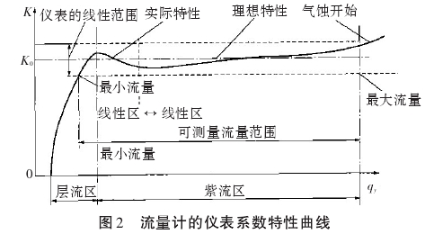 儀表常數(shù)特性曲線如圖2所示。從圖2可以看出,儀表常數(shù)的線性范圍與標(biāo)定系數(shù)K。的關(guān)系直接影響著流量計(jì)的精度。