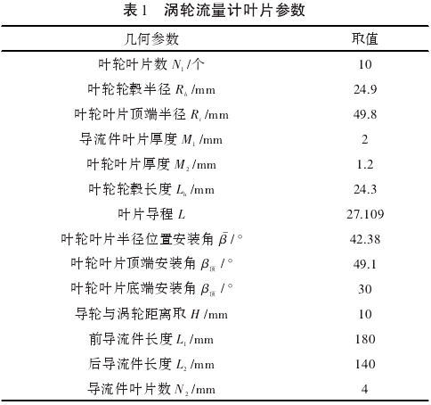 渦輪流量計(jì)口徑大小不同,葉片數(shù)量也應(yīng)不同。小口徑的流量計(jì)(D≤100mm),葉輪葉片數(shù)量通常為3~8片;大口徑的流量計(jì)(D>100mm;),葉輪葉片數(shù)則通常為10片以上5。根據(jù)流量計(jì)設(shè)計(jì)準(zhǔn)則得出的參數(shù)如表1所示。
