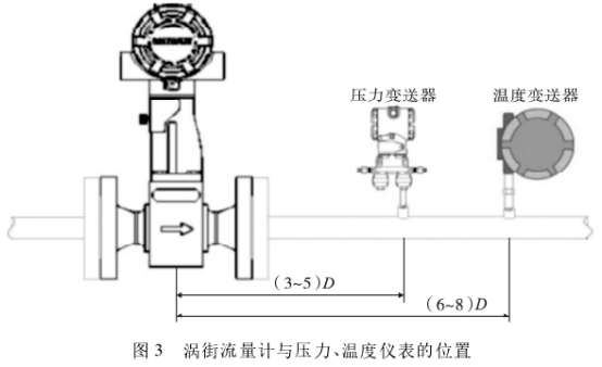渦街流量計的口徑如果與工藝管道相同,不能滿足流量儀表要求時,或者在此流速下測量準確度不能保證時,需要縮小儀表口徑,從而提高管內流速,保證測量精度。上下游必須有足夠的直管段,若傳感器安裝點的上游在同一平面上有2個90°彎頭時,上游直管段≥25D,下游直管段≥5D。根據測量的需要,需在渦街流量計附近測量壓力和溫度時,測壓點應在傳感器下游的(3~5)D處,測溫點應在傳感器下游的(6~8)D處,如圖3所示。