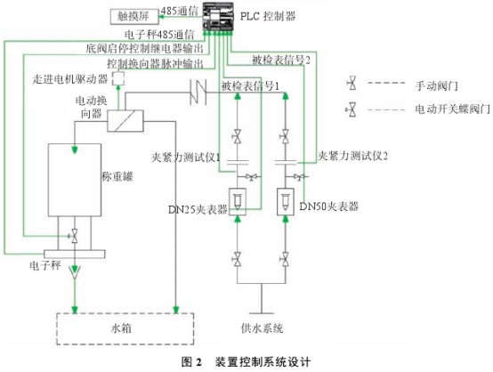 金屬管浮子流量計裝置控制部分主要包括夾緊力控制系統、換向器控制系統和稱重控制系統(圖2),獲取電子稱讀數、控制夾表器、控制換向器動作" />